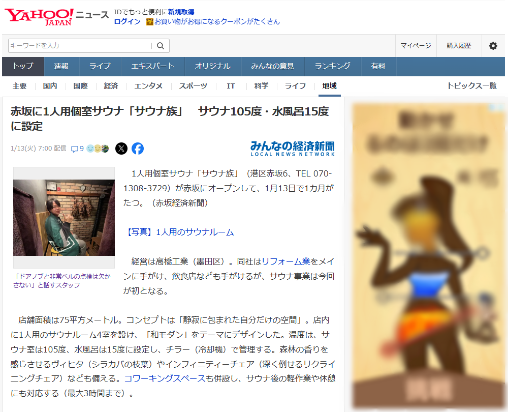 Yahoo!ニュースに掲載されました 2026.01.16メディア情報 HOME ブログ メディア情報 Yahoo!ニュースに掲載されました サウナ族のオープンから1カ月が経ちました。地域メディアの赤坂経済新聞様が当社のサウナ族を取材してくださりました。 情報は下記から見れます。 赤坂経済新聞 Post Share Hatena Line note 関連記事一覧 関連記事はありません。